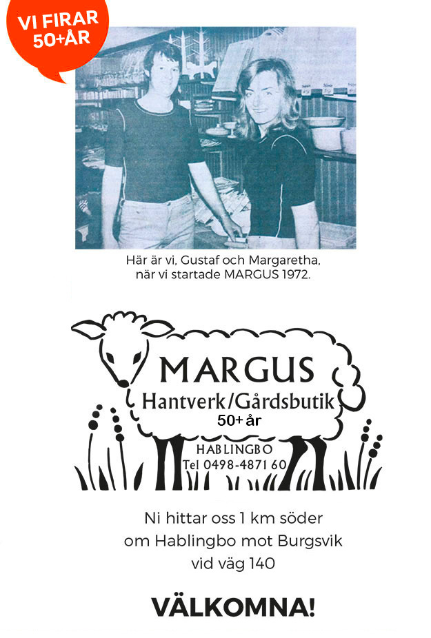 Margus startade 1972 i Tofta. Företagsnamnet kommer från Margaretha och Gustaf som driver företaget. 2001 öppnades ytterligare en butik i Hablingbo. Butiken i Tofta avvecklades 2006 och vi satsar nu enbart på Margus i Hablingbo.